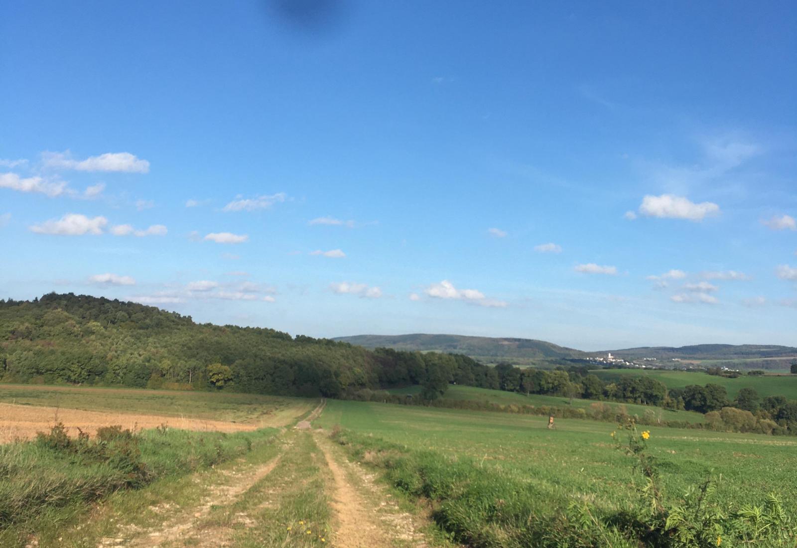 Wieder in Deutschland führt die Route permanent auf und ab. Und zwar jedes Mal relativ lang und steil und wirklich ohne Pause. Das kostete ein paar Körner. Aber immerhin kam ich durch das Gewerbegebiet von Pirmasens (unbedingt umfahren!!). Das motorisierte Verkehrsaufkommen war definitiv zu hoch und es ging mir leicht an die Nerven. Der Weg nach Dahn brachte Besserung, dort gabs einen Falafel und ich wollte den Rest der Tour planen. Leider blieb nicht mehr viel Zeit übrig, es war schon 14 Uhr und ich wollte am gleichen Tag noch zurück nach Bonn. Die einzig sinnvolle Zugverbindung war ab Kaiserslautern, bis dahin waren es noch ca 3h Fahrtzeit.