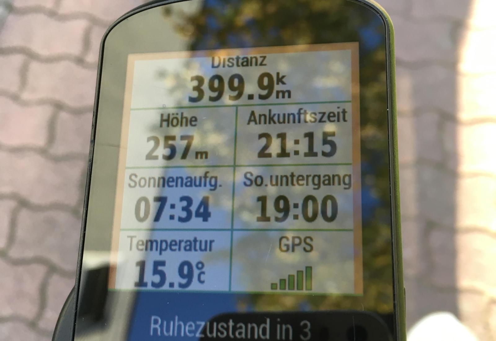 Angekommen am Bahnhof, meldete mein Kilometerzähler 399,9. Ok, die Ehrenrunde kurz über die Straße und zurück schaffe ich nun auch noch. Zack, da waren die 400 voll.