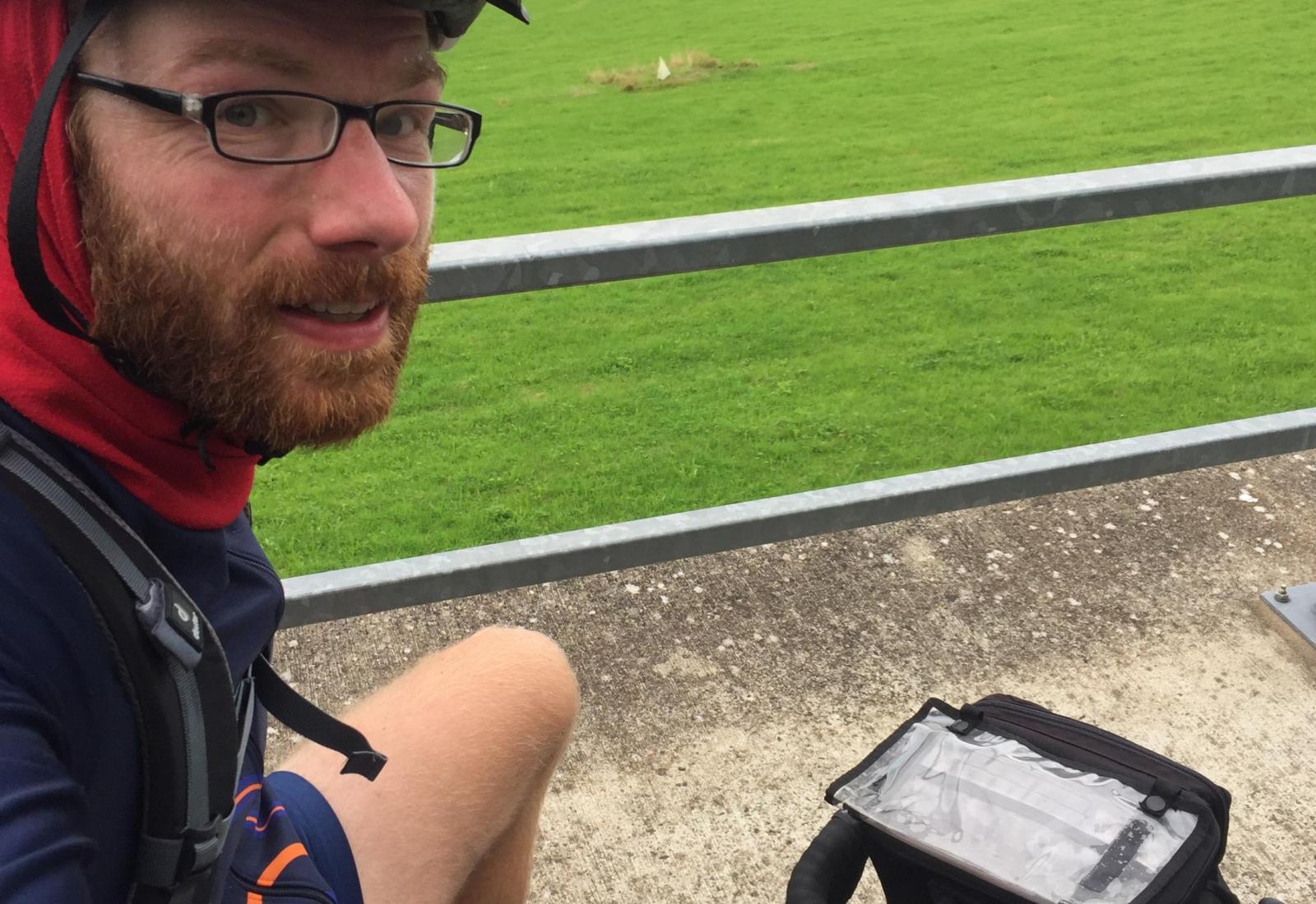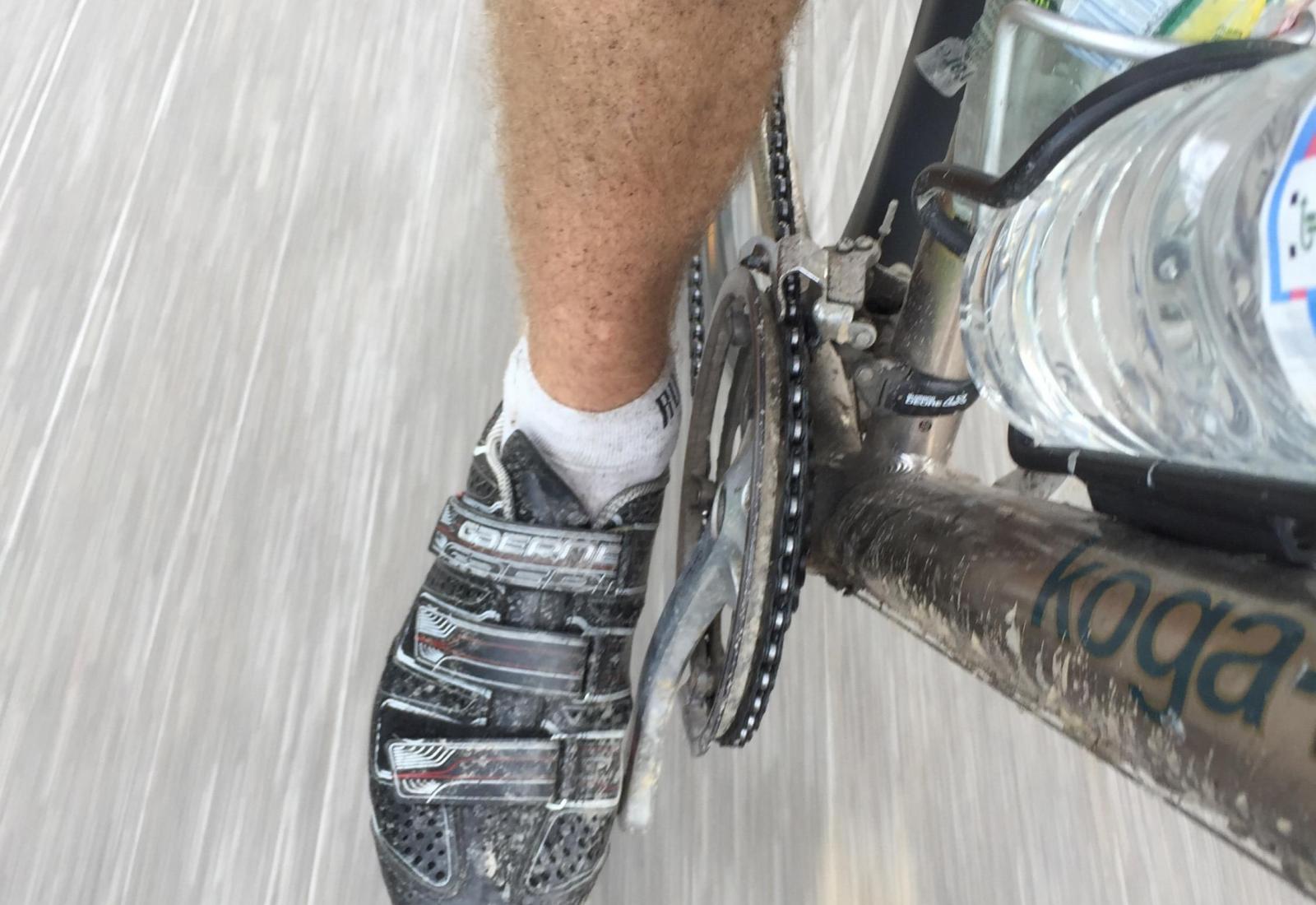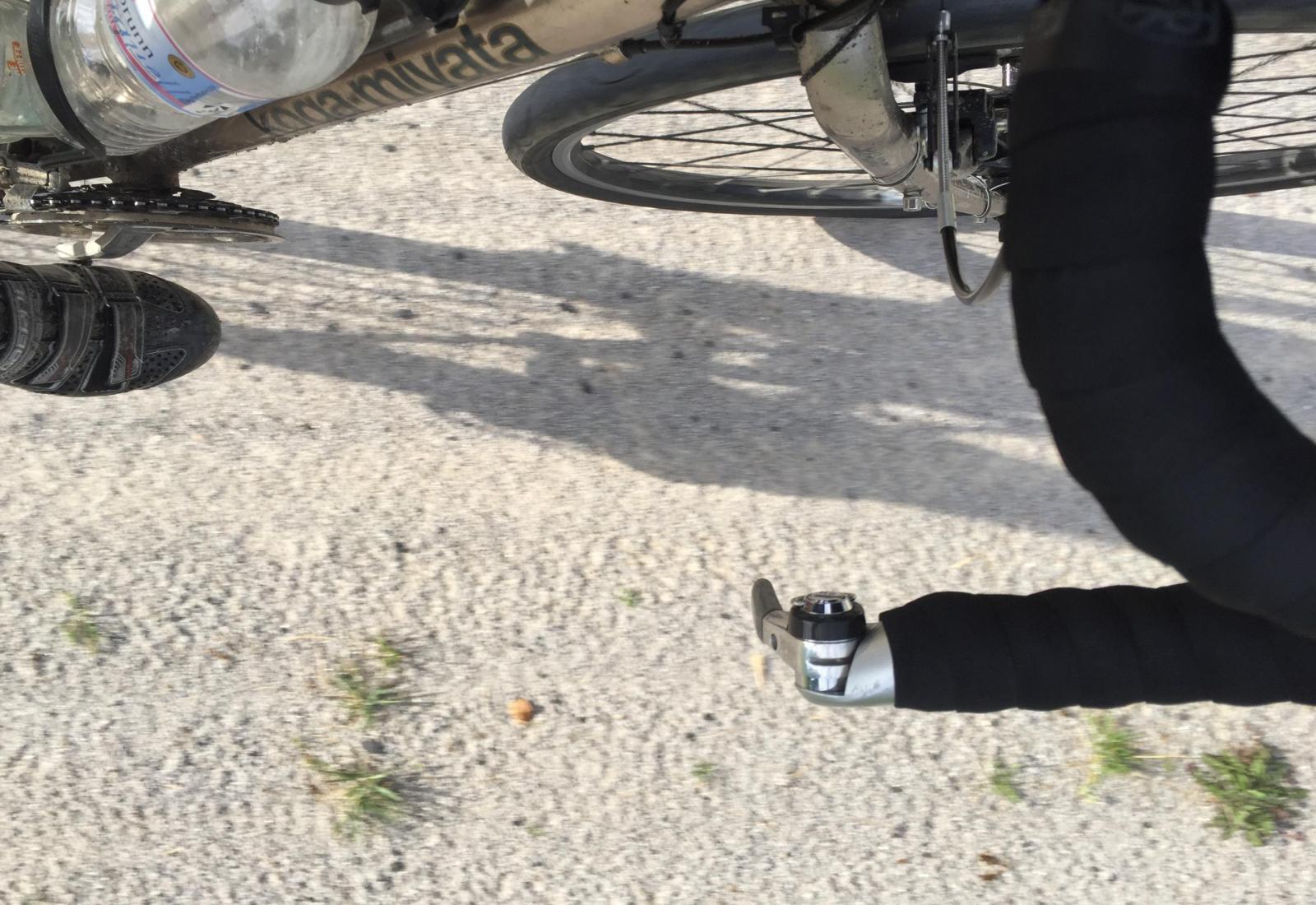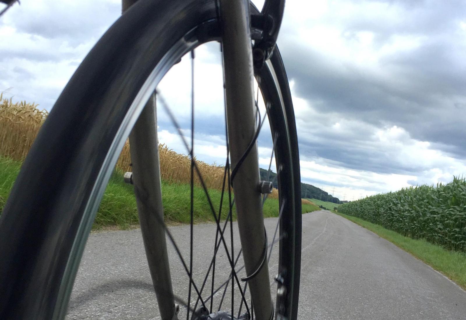 Das Gepäck überraschte mich auch als ich beim Losfahren in die Klickpedale finden wollte: Es ist einfach schwieriger ein moderat bepacktes Rad anzufahren als ein nicht bepacktes. Anstatt noch einige Sekunden zu balancieren, passiert etwas anderes: Man fällt in Nachbars Garten. Irgendwas landete dabei auf meinem linken Knie, was ich noch den ganzen Tag über merkte.