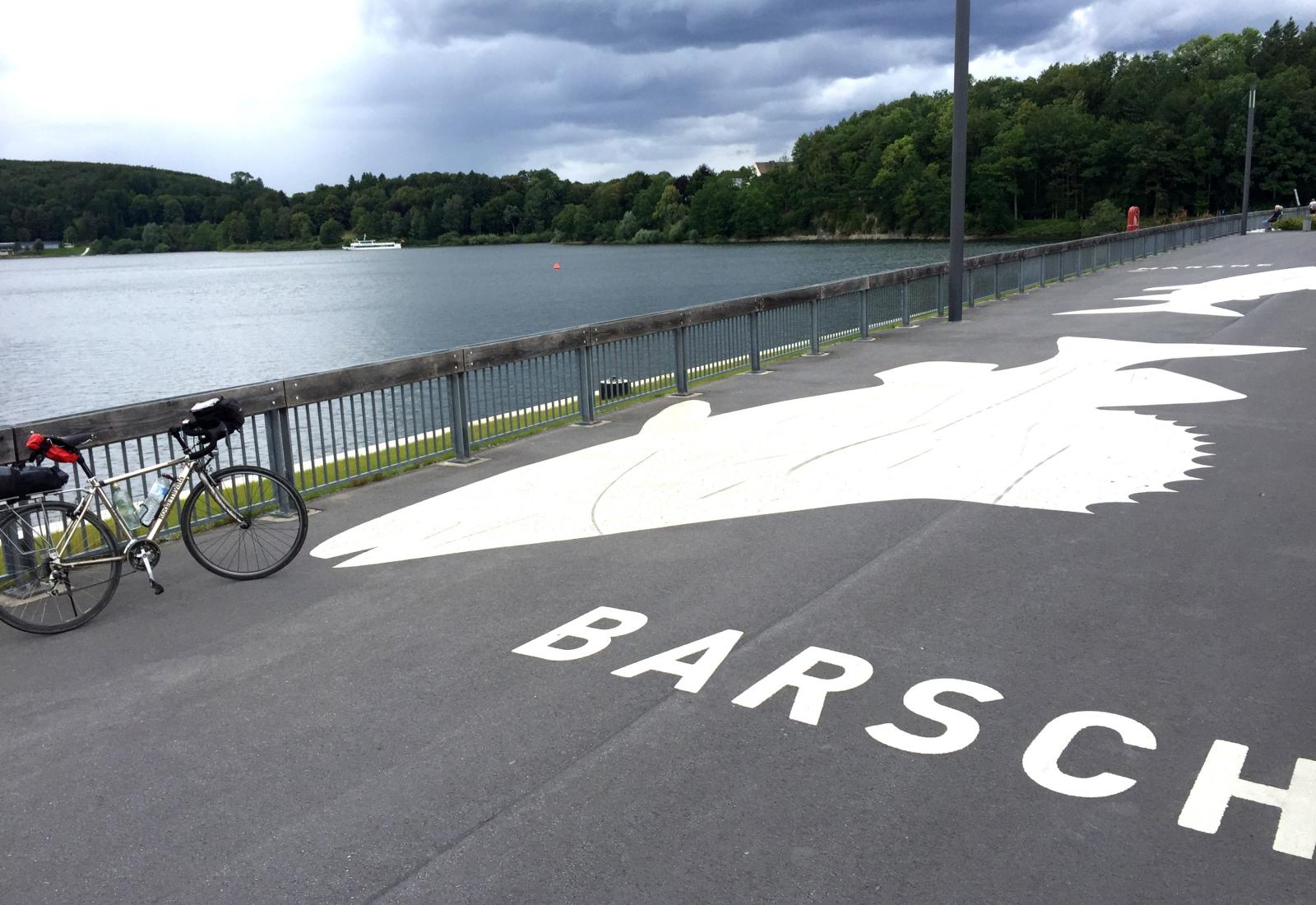 Bis Waldbröl führte die Strecke teils über Hauptstraßen und teils über (schlammige) Waldwege, schön abwechslungsreich. In Waldbröl wunderte mich die Wegeführung etwas: Oberhalb vom Ort führte der Weg wie auf einer Mauer entlang, ohne das erkennbar war, warum diese dort stand. „Das nennen se Hitlermauer“ erzählte ein anderer Radfahrer seinem Kumpanen.