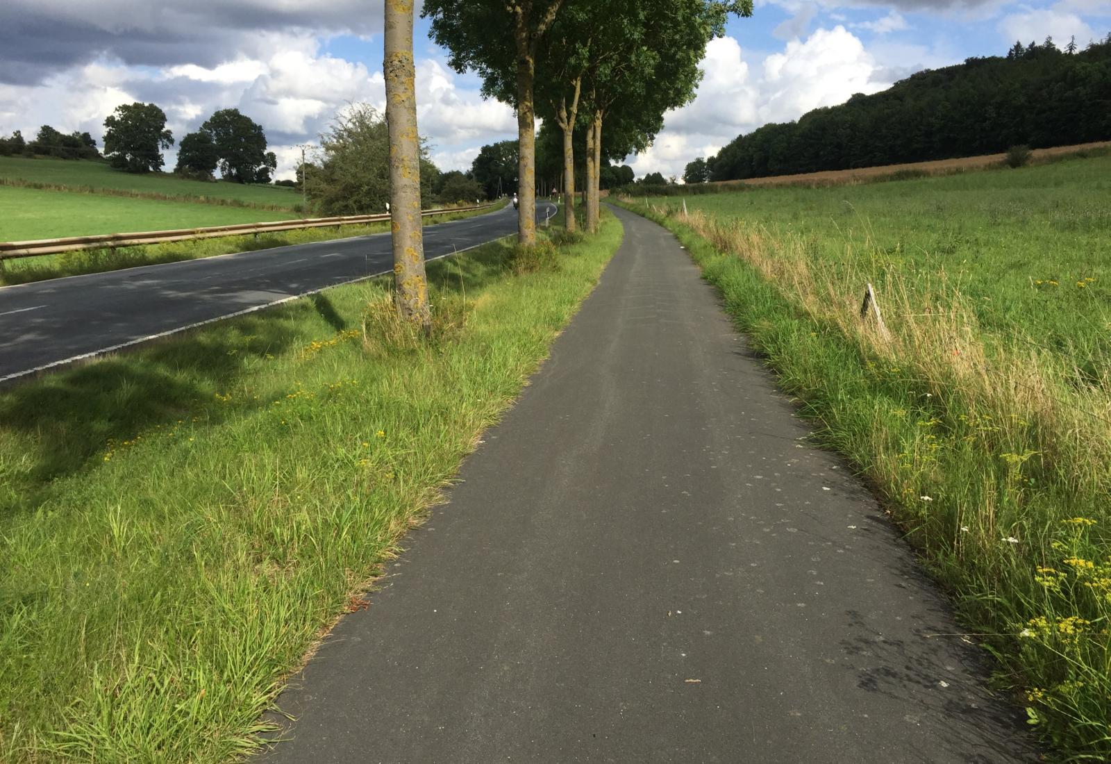 Kurz vor Brilon, als sich der Nachmittag schon seinem Ende näherte und immernoch ca 70 km vor mir lagen, setzte mir nicht nur der Fettklumpen im Bauch zu, sondern auch die vielen Autos. Die Strecke führte nun über weite Teile direkt an viel befahrenen Straßen, z.T. Bundesstraßen entlang. Zwar auf einem separaten Weg und nicht direkt auf der Straße, jedoch macht der viele Verkehr auf Dauer echt müde. Da fahre ich lieber ein paar mehr Berge hoch, anstatt den ganzen Tag an Hauptverkehrsstraßen entlang. Jedenfalls dachte ich kurz ans aufgeben und daran in den Zug zu steigen. Von Brilon aus hätte die Zugfahrt noch 2:20 h gedauert, was mir dann aber doch viel zu lang vor kam.